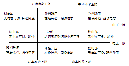 根据VQC的调控要求,应将受控母线电压控制在规定的电压上下限之间,确保电压合格,同时尽量使无功控制在规定的无功上下限之间,如果电压、无功不能同时达到要求,则优先保证电压合格。九区图各区域的控制策略示意如下。